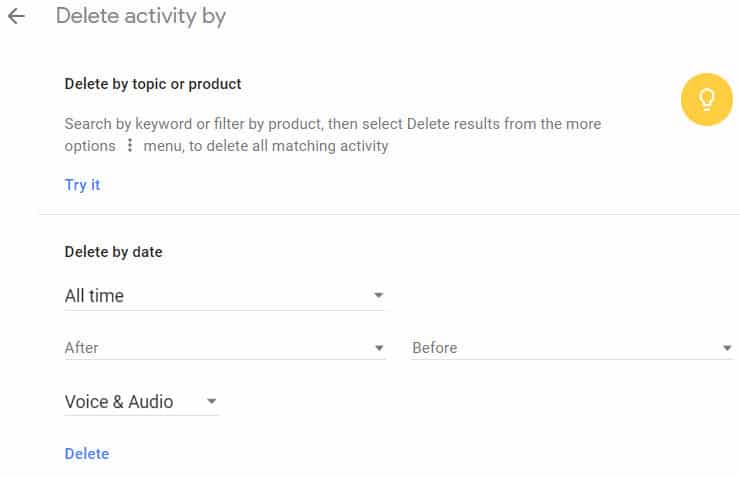 But to delete all data, click ‘Delete Activity By’. this link is located in the left-hand navigation. Use the ‘All Time’ option when you set the time. Pick Assistant or Voice and Audio and click delete.