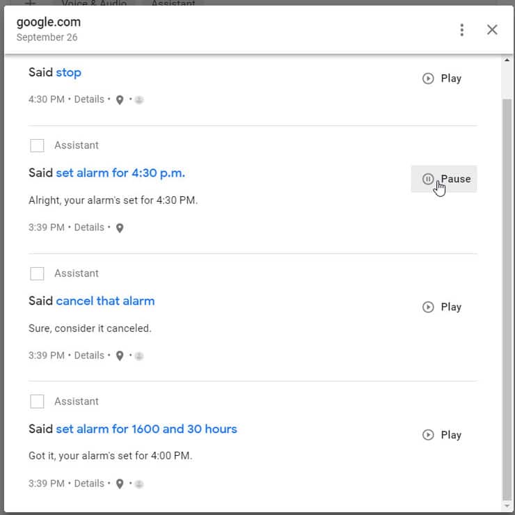 Each individual entry on the page has its own menu. It is indicated by the three-dot menu. Clicking on it shows you which device or app heard the command. Tap delete and confirm to delete.