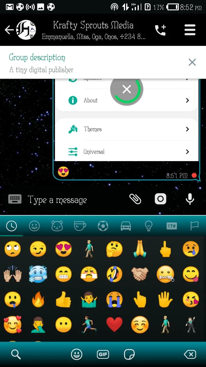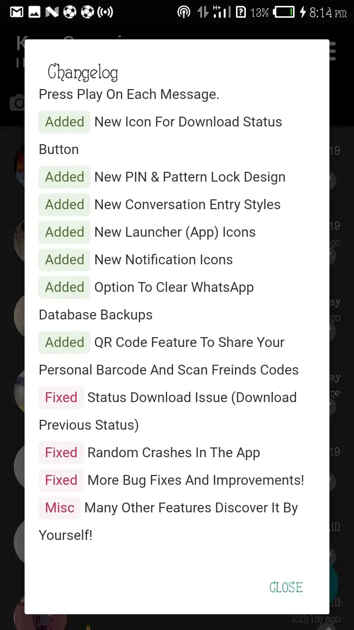 Also, there is a new icon for status download, new pin and pattern lock design, new conversation entry styles, new icons, etc. The Emoji options have been added, status download has been fixed… Still going through it to see if it will be worth having a tips and trick article on