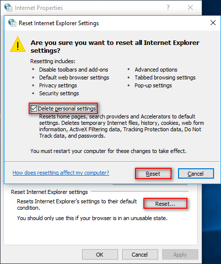 - Locate Reset Internet Explorer settings area and click Reset button.